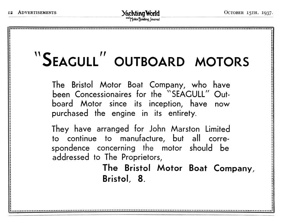 The company moved to 'Fleetworks', Poole in Dorset in 1938. The name 'Marston' was dropped and the company renamed 'British Seagull', with that phrase, ' The best Outboard Engine for the World'.
