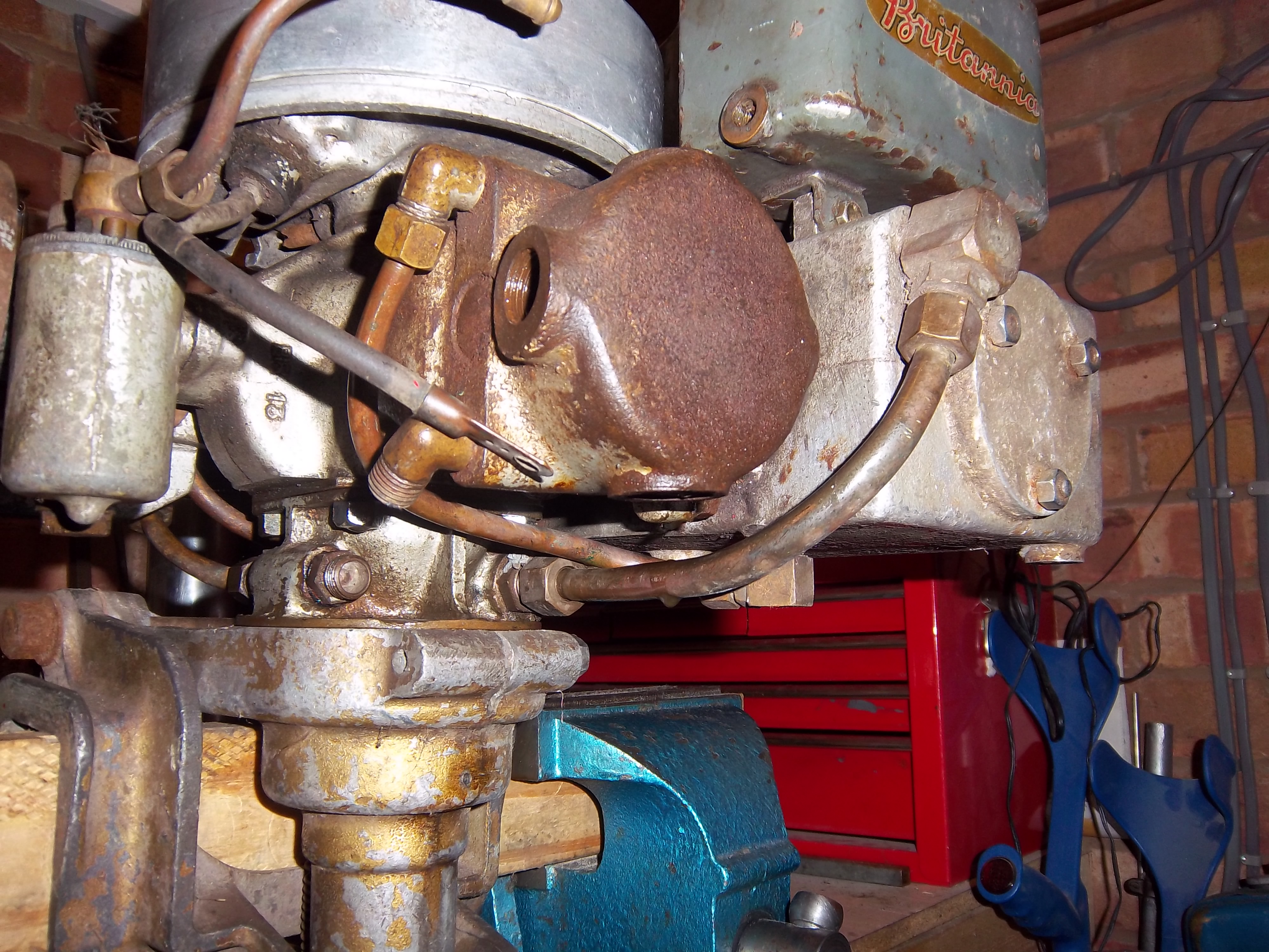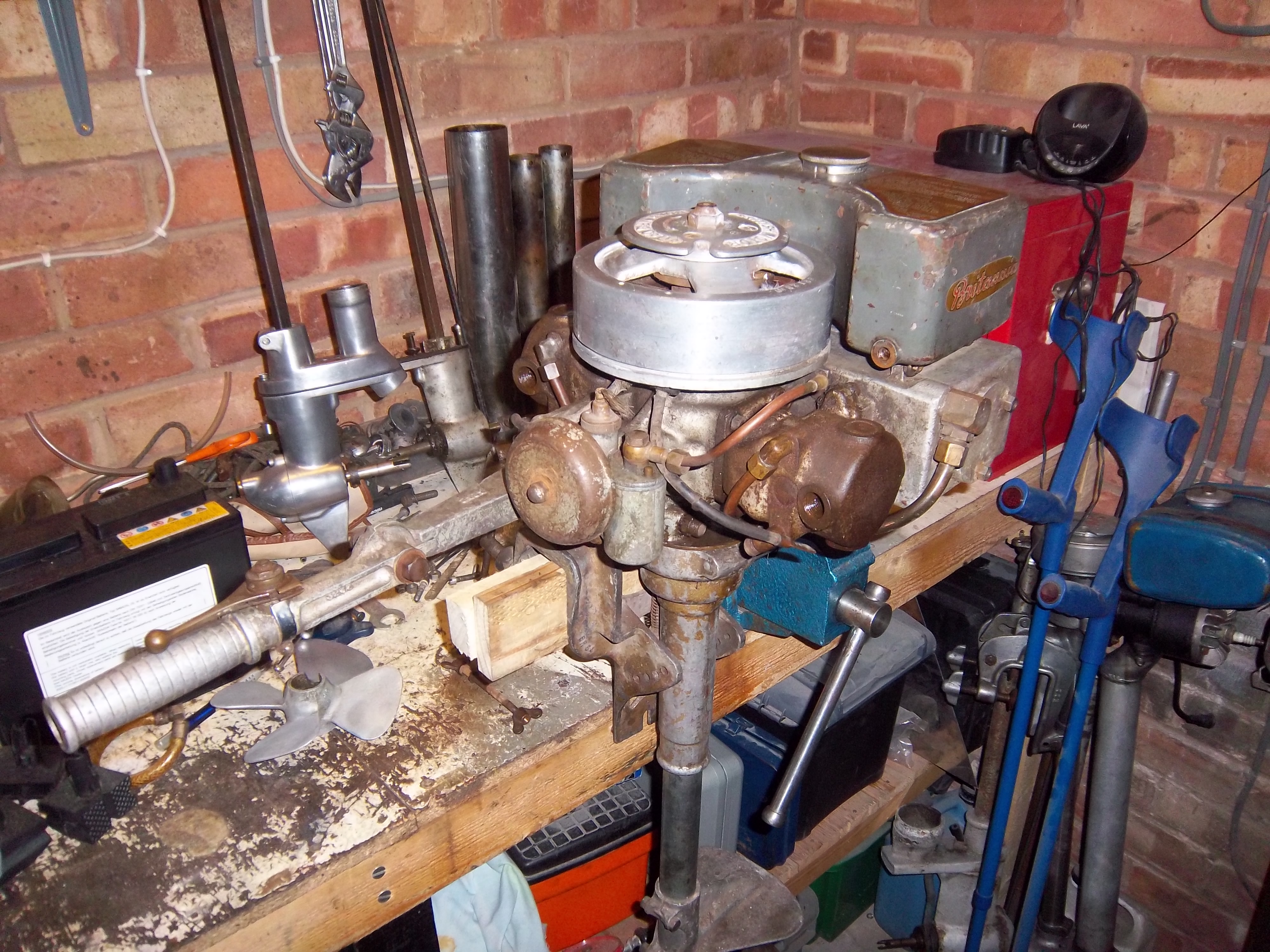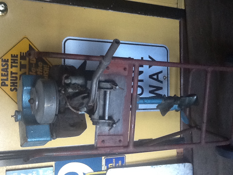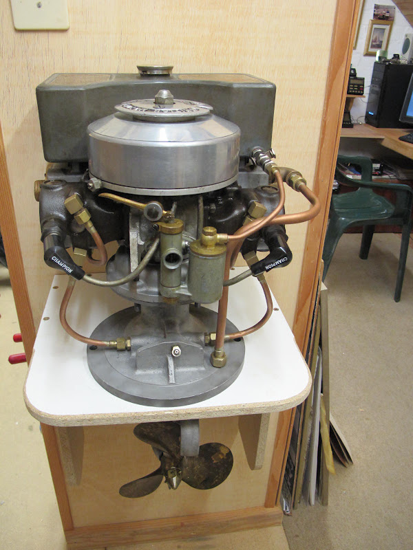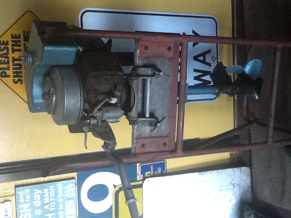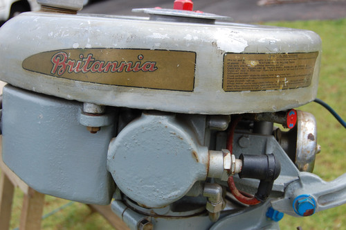 I believe the outboard that Notav8 has is actually a Britannia Ensign from the late 30's. It should have a cast aluminium cover which protects the spark plugs and carb - hence the different style of cylinders. The carb and throttle are correct as both the throttle and choke lever would protrude through the cover.