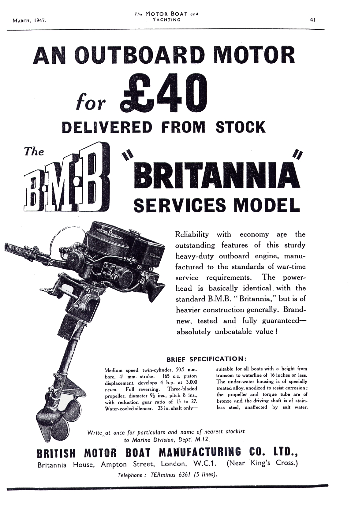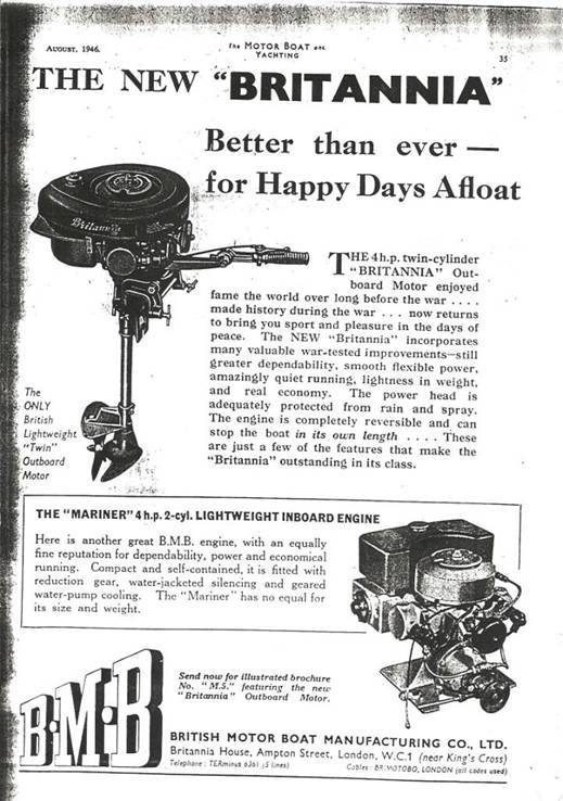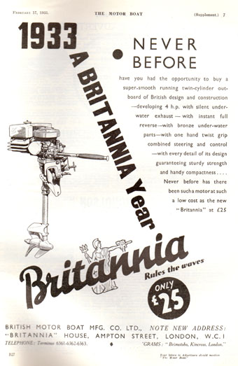 The original Britannia Light Twin was introduced in late 1932 with a chromed lower unit with a two bladed vacuum propeller. 1934 this was changed to a three bladed propeller and water scoop. 1946 saw the engine have a steamlined fuel tank and an aluminium lower unit, with a wooden grab handle being added a couple years later. But the blue tank motor that Oyster posted is different, I have found a 1947 advert which referred to this as a 'Services Model' - but when it was introduced or whether this saw war time service I have no idea!