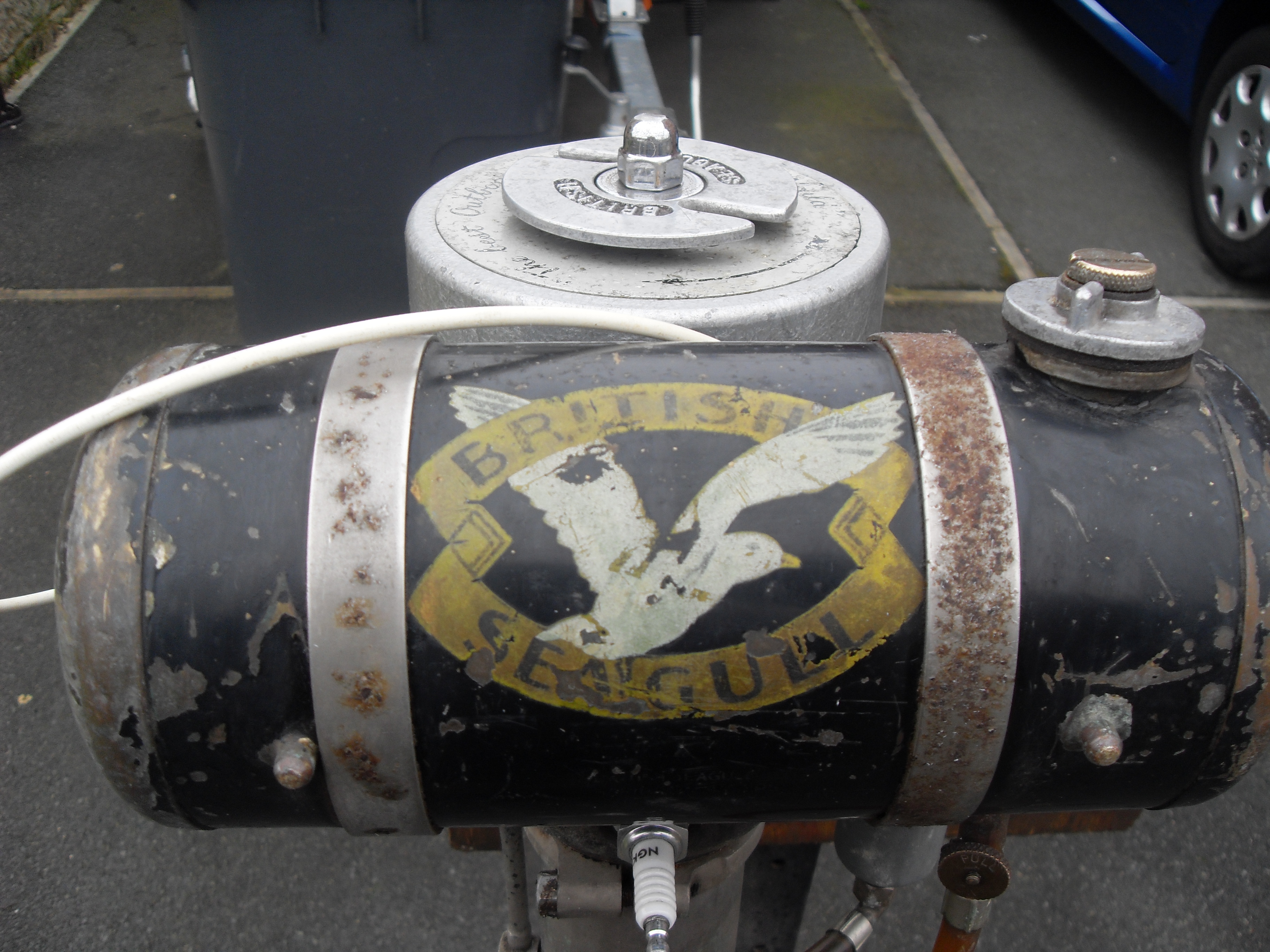 I'm glad you approve of my rather original looking fuel tank. I quite like the look of something that has a certain patina to it, and for this tank at least all i shall be doing with it is a light tidy up of any missing black paint and a touch up here and there of any gold with a final coat of clear lacquer. The retaining straps in time will either get replaced for stainless or good second hand ones as and when they become available. As far as i can make out to date the flywheel covers for these earlier ignitions didn't have any scripting on them, just plain. The pics of my AD that were taken at the time i first acquired the motor show it with a later type ignition and has since been swapped with something more in keeping of its age.(it actually came with the original magneto and cover when i bought it which was a bonus for me) A bit later on in production in the mid 50's you begin to see scripted covers with "the best outboard motor in the world" which later got changed to "for the world", so yours having virtually no scripting left on it is probably not such a bad thing after all