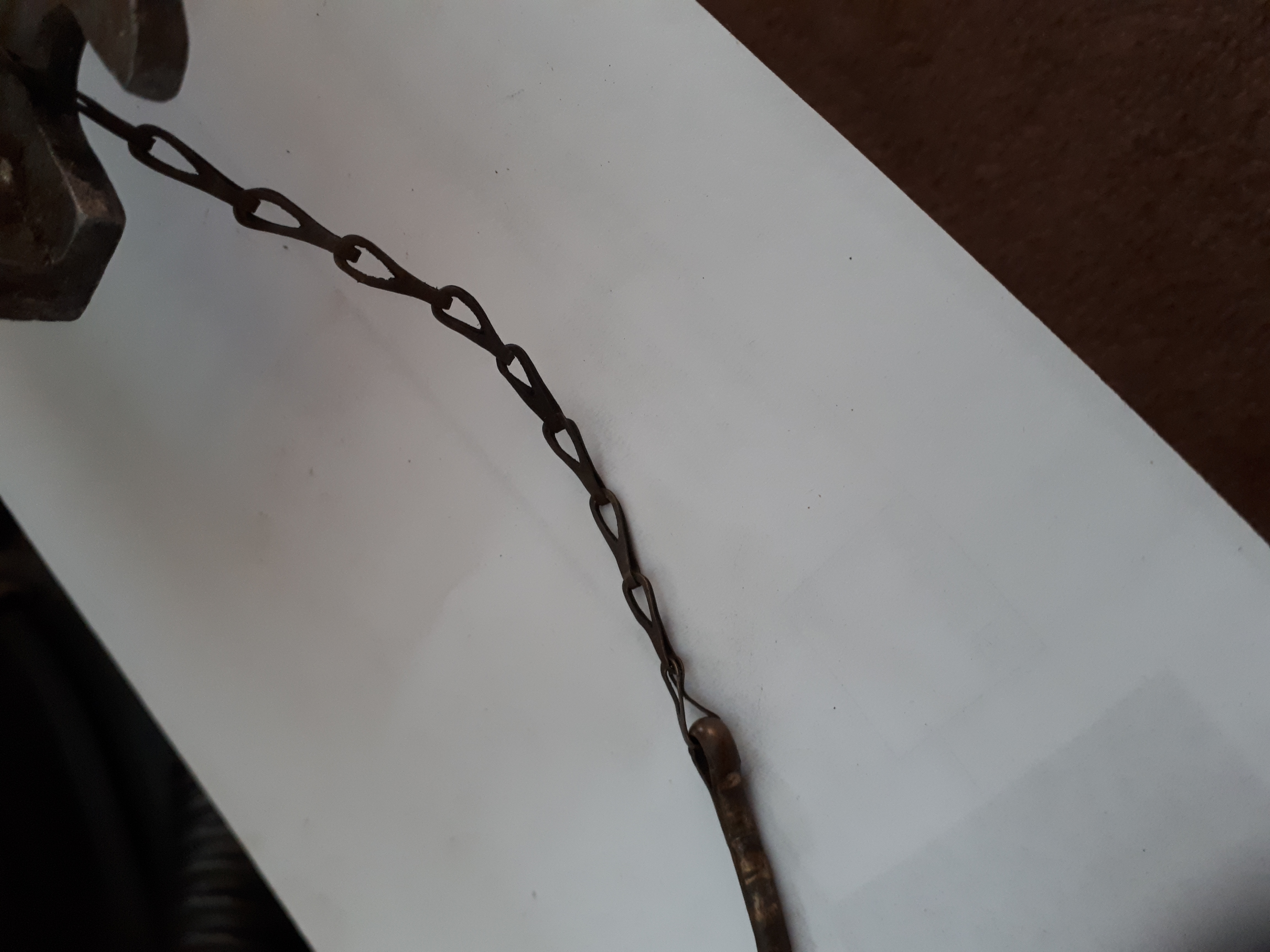 I've been talking to everyone I know who's got a skeletal bracket to find the details of their safety chandelier chains, the pitch of the chain seems to be 2.5 links per inch, which is the same as the safety chain on the bayonet fuel cap & the retaining chain on the locking pin that stops the motor falling off the transom bracket.