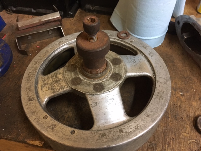 My two early 1930s Britannia engines have a puller built in to the flywheel, which uses the nut and the rope pulley to allow the nut to be unwound and to hopefully pull the flywheel off. Quite a neat design