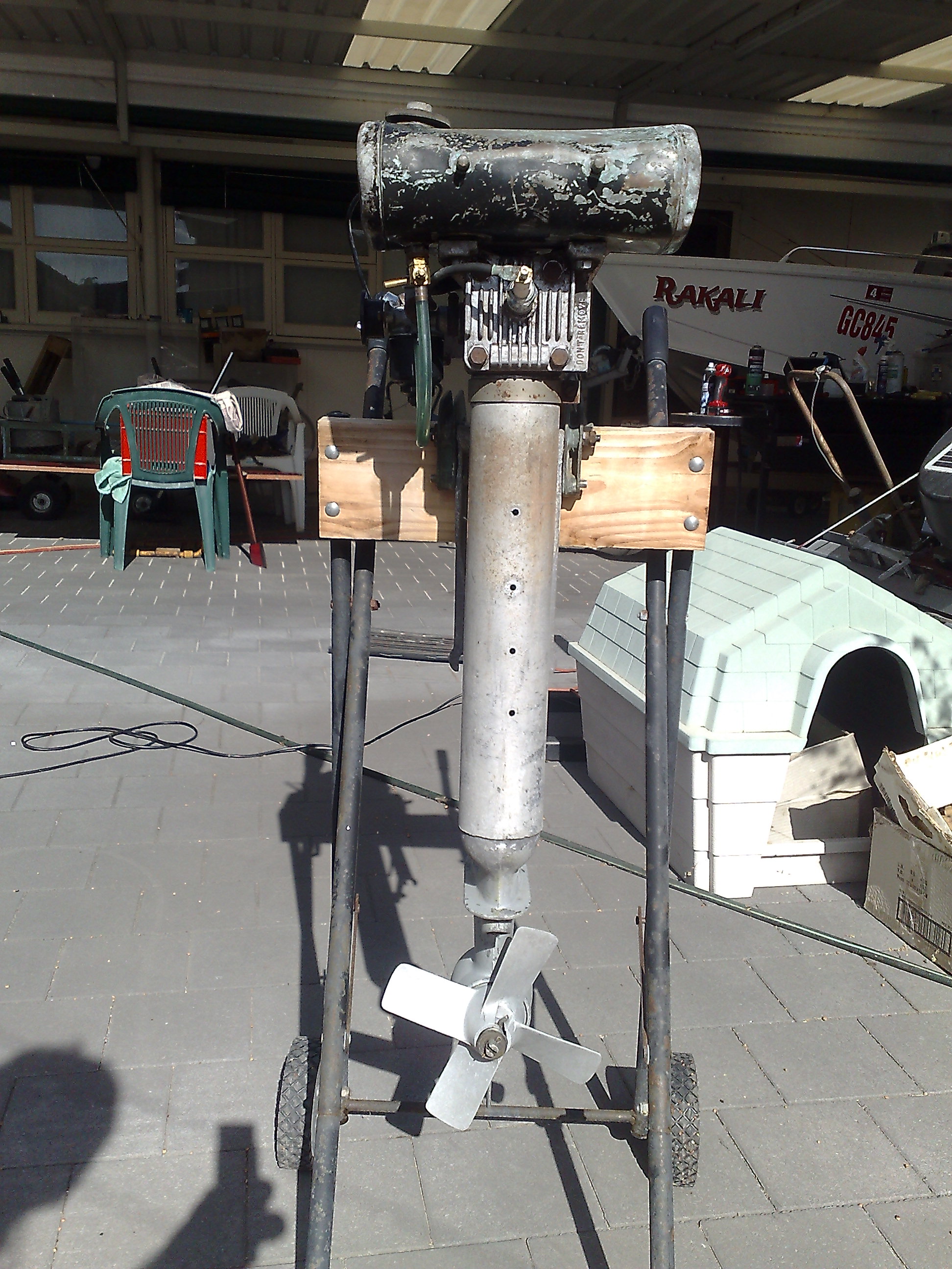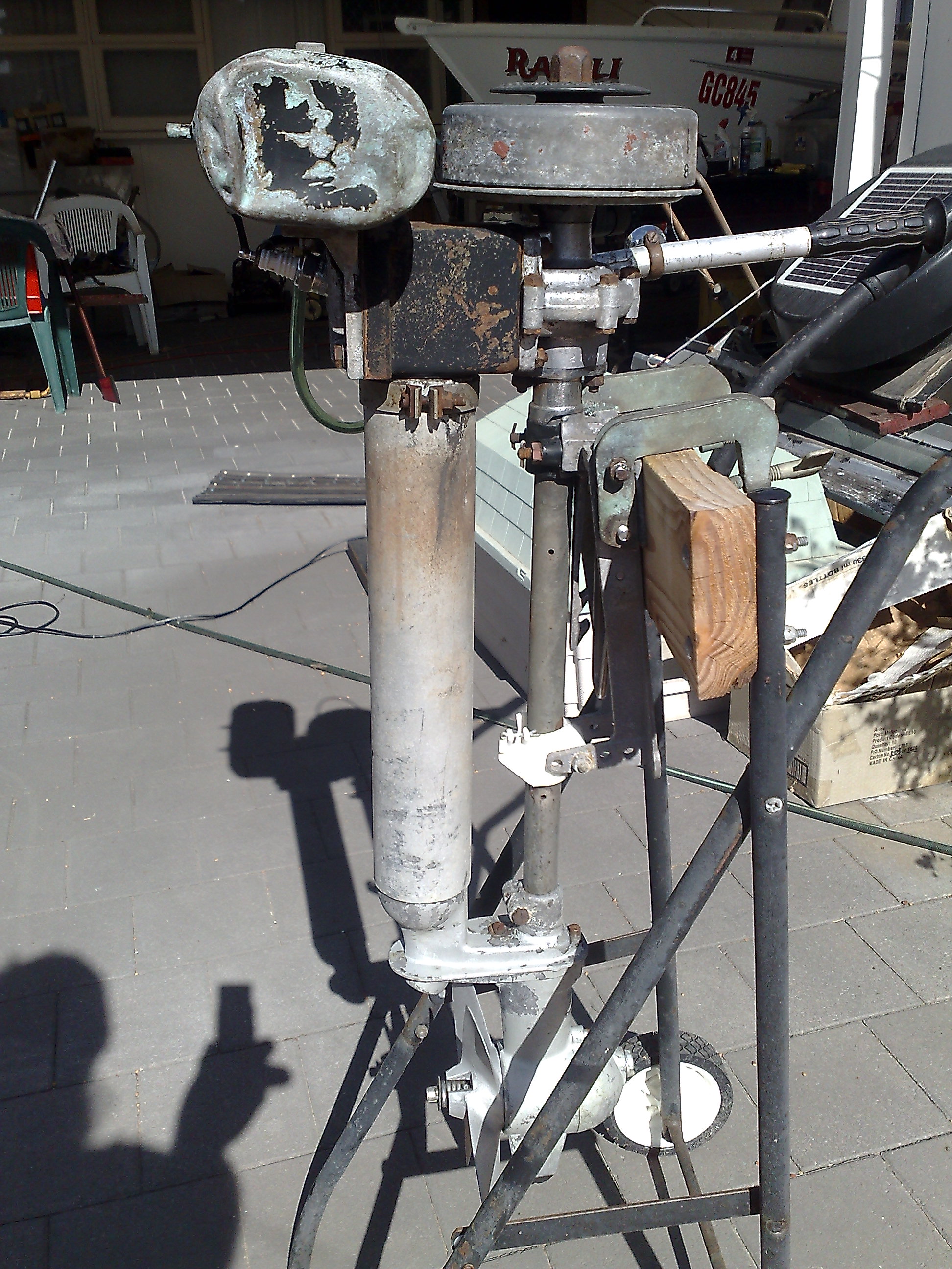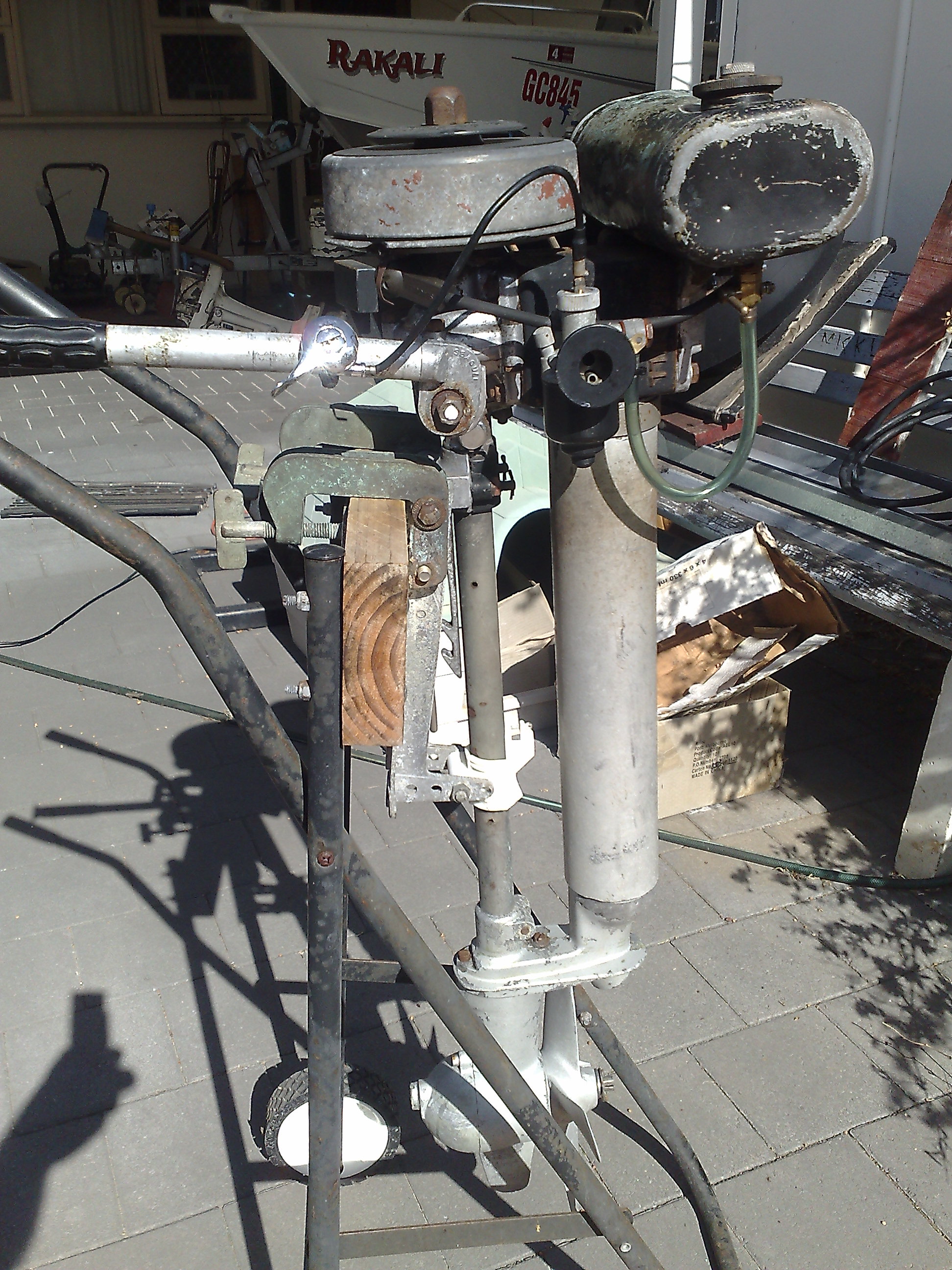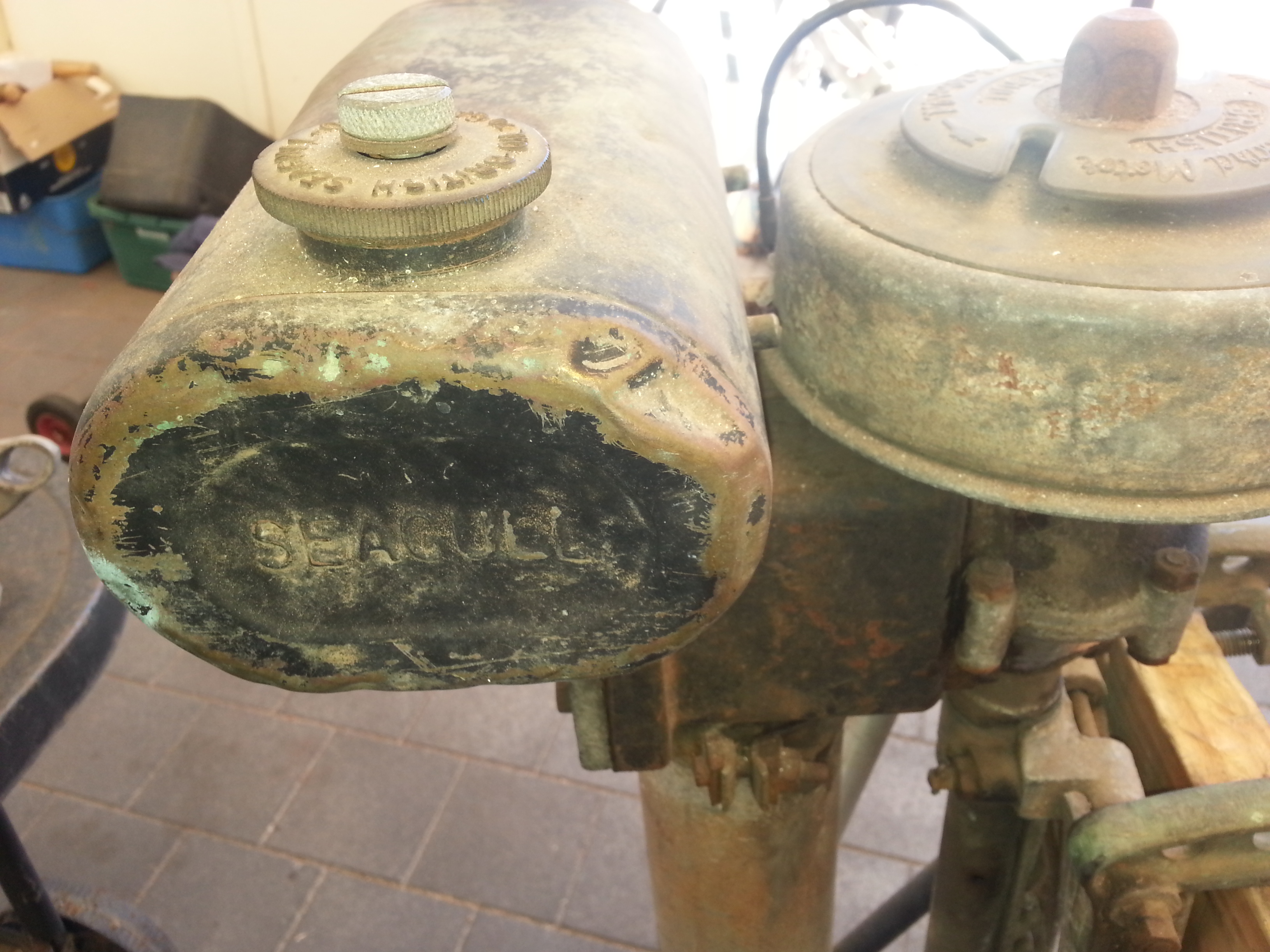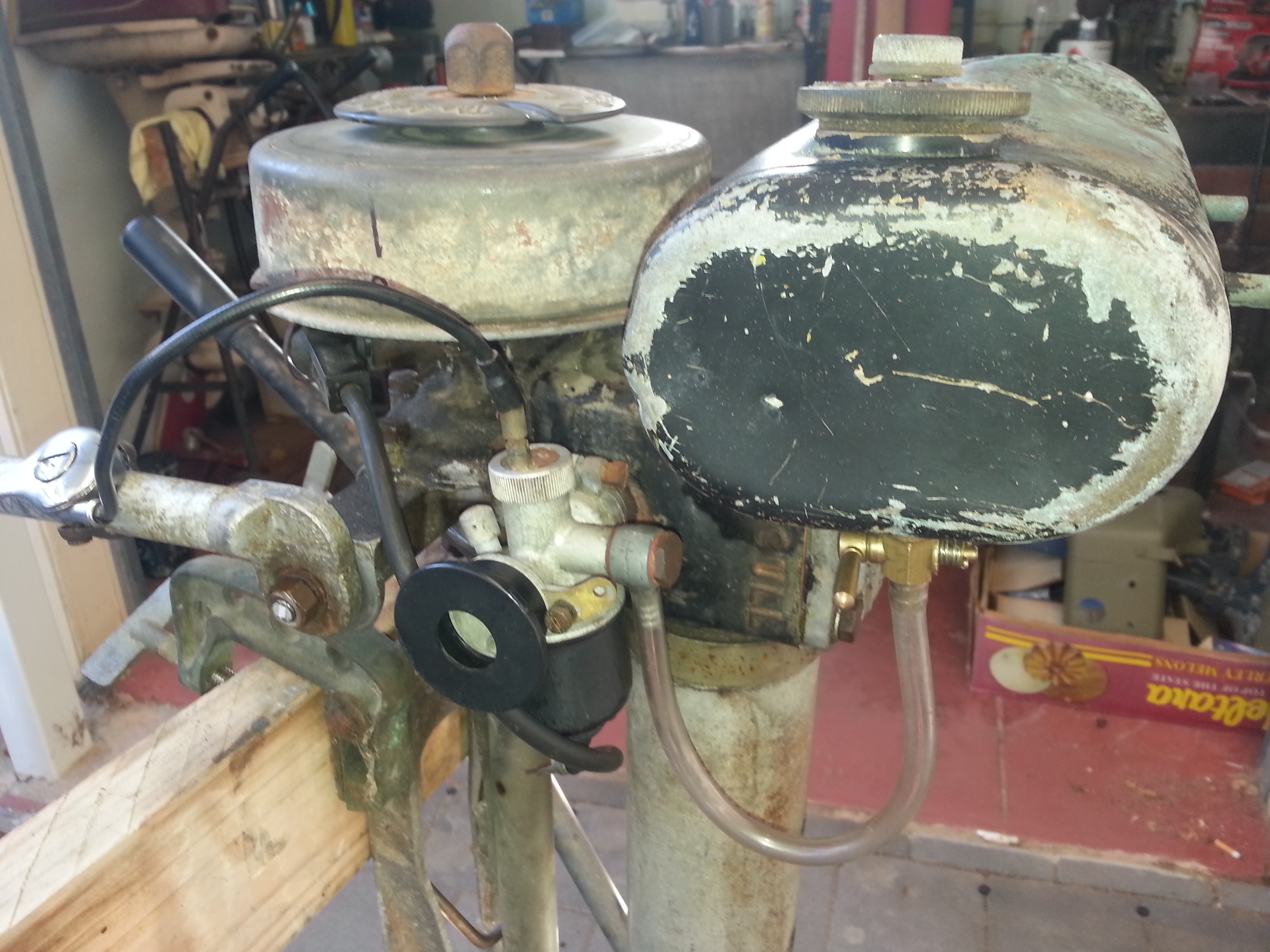 Found a mint tank in a box of em and bits to make a decent transom bracket to suite the year.