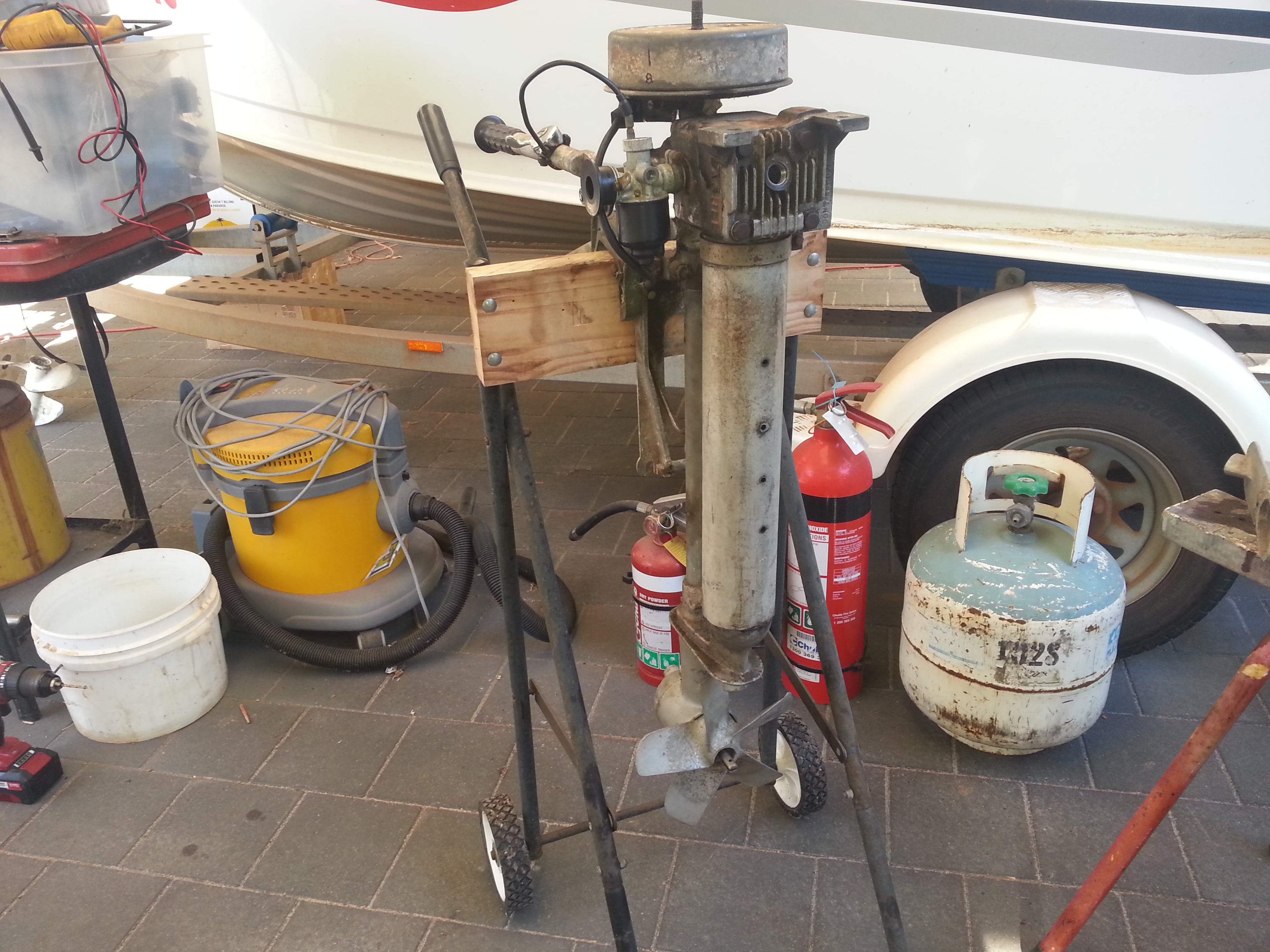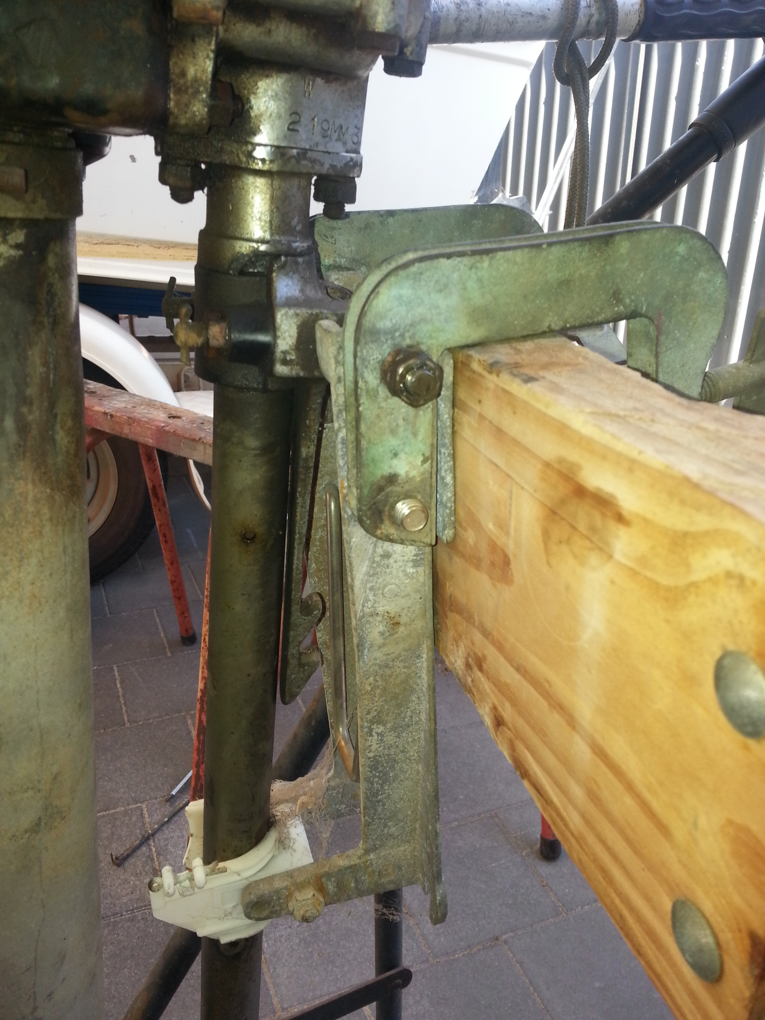 Had to remove the poor bashed and bent transom bracket so that at least I can secure the motor to the blue tub of tears.