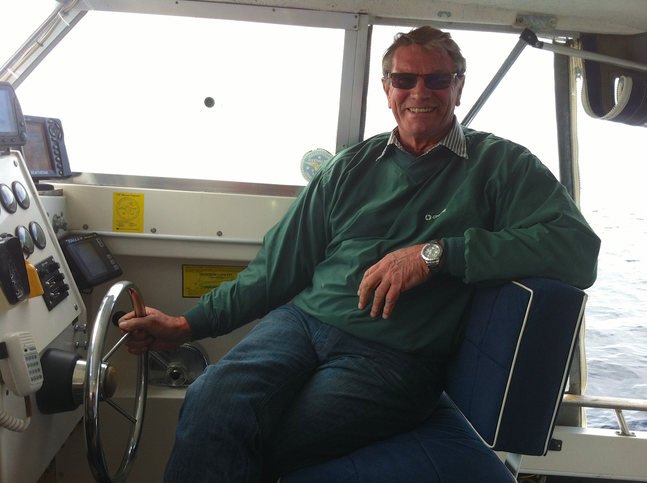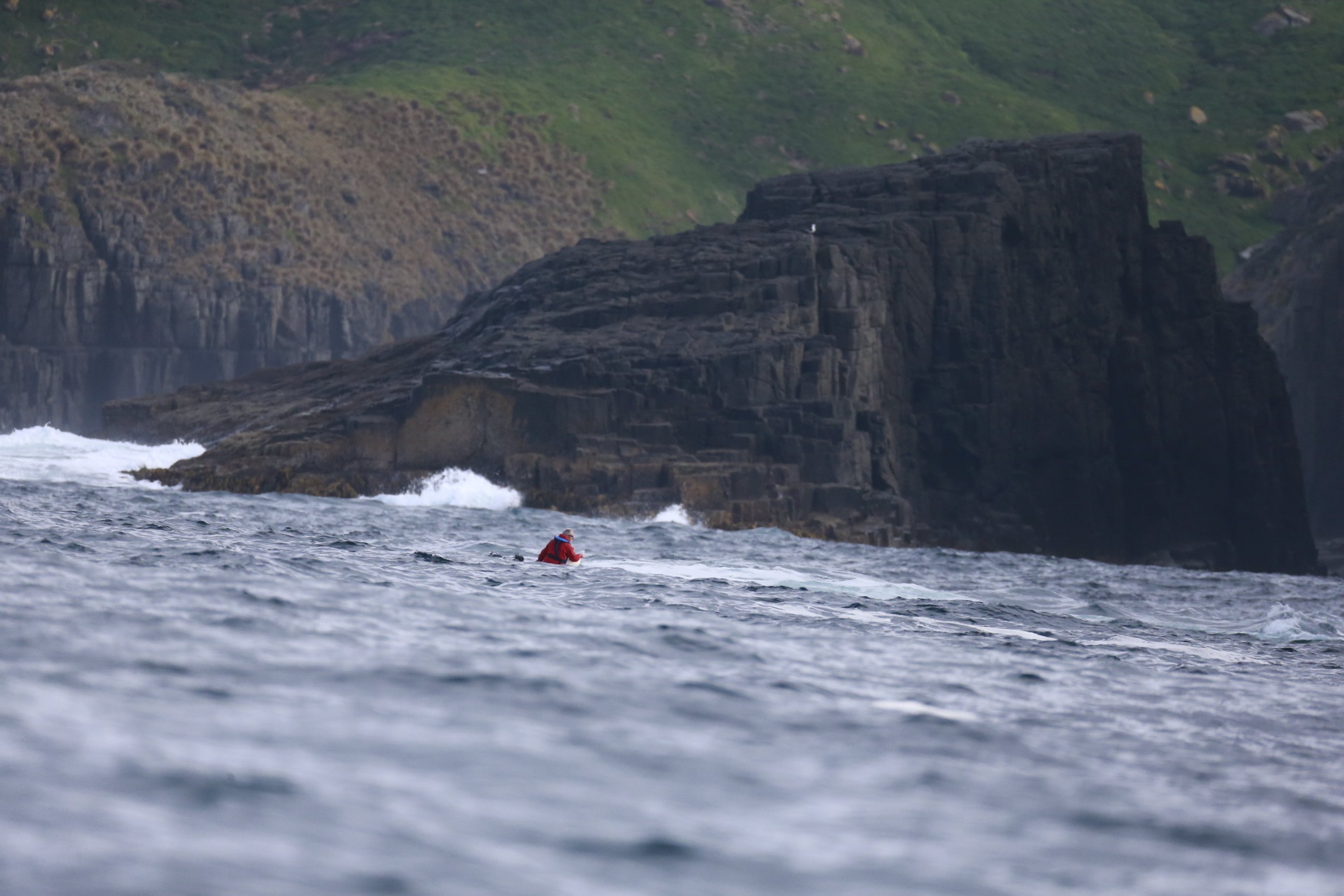 Once around Cape Bruny, the course was due east in the true Great Southern Ocean (complex lines here with the Tasman Sea) with nothing between us and Antarctica, some 1400 nautical miles (NM) to the south. The full size of the swell was now apparent and the support vessel regularly dropped from view on the other side of a swell, even though it was not more than a couple of 100 yards away.