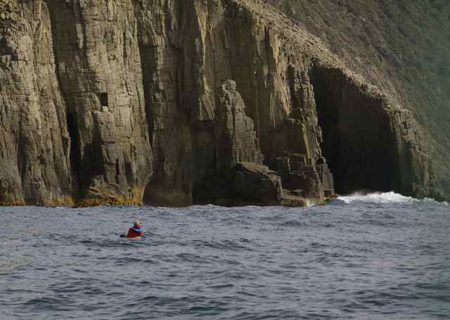 We left the boat ramp at a little after 05.00 and headed directly for Partridge Island Channel, a narrow strip of shallow water separating Bruny from Partridge through which our support vessel could not pass. As we passed through the light just started to filter through showing smooth, crystal clear water over the sandy bottom. Once through and reunited with our support vessel we headed southeast along the Labillardiere Peninsula in quiet seas with the long rolling swells that were just starting to build.
