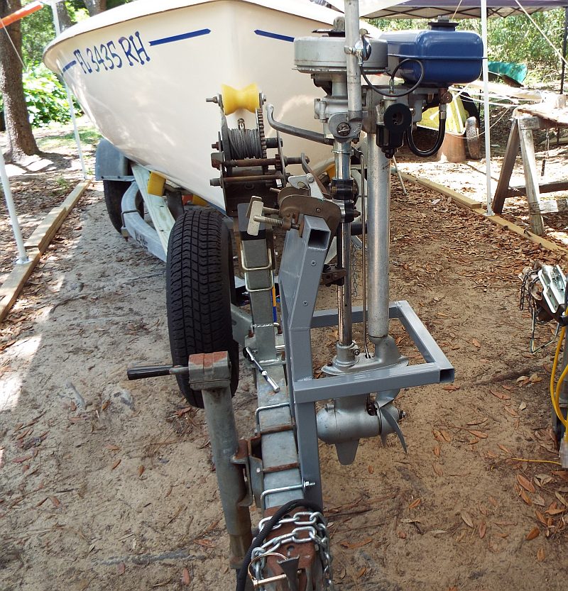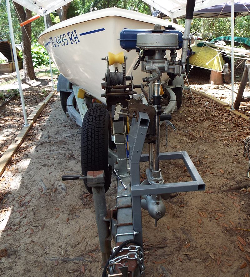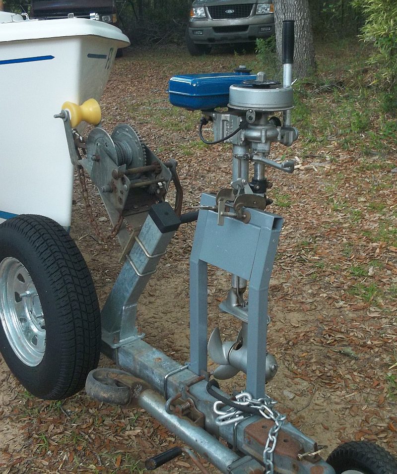 Charles makes a good point when turning left or right in that the lower unit will want to "swing" outwards, possibly ending in disaster or complete detachment from its transom mounting altogether.There's not much that secures the bent pin holding the motor to the mounting other than a snap-fit. Unless your roads are nice and flat with no pot holes, chances are there will be a lot of "bouncing" and vibrations at the trailer side. A little seagull perched on a length of metal box section/timber relying purely on how tight the thumbscrews are tightened is perhaps chancing your luck.