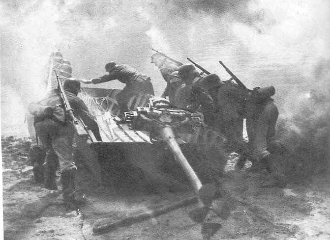 OTD in #Normandy Infantry of 43rd Wessex embarking in a boat to cross the River Seine at Vernon