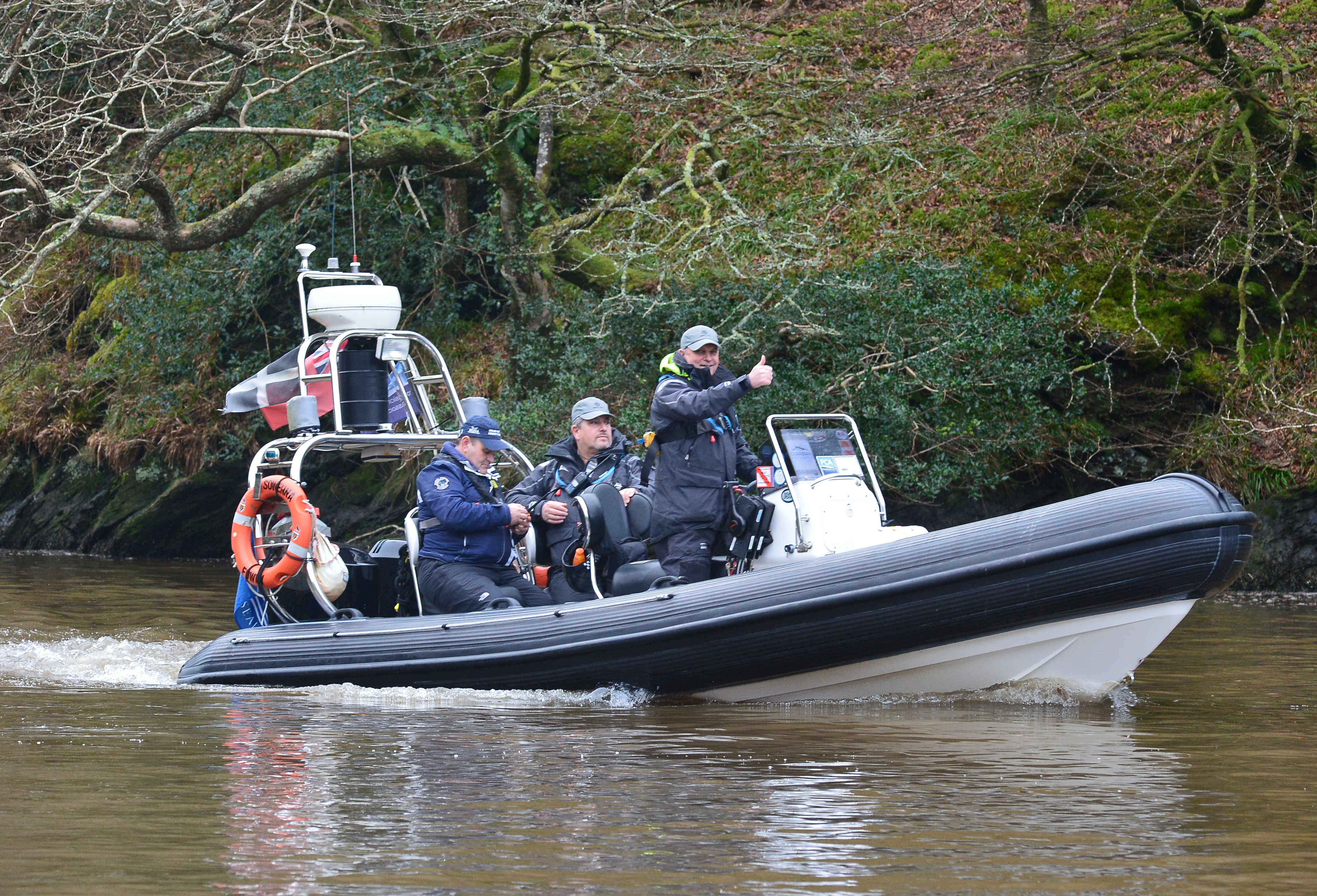 Ah that's our very own River Fowey guard ship - owned and operated by a retired cop who is our Marine Special Constable. His boat is MCA certificated and fitted with blue lights for use as a police boat. He has patrolled this coast for several years including joint patrols with other Agencies. A great asset for us. His blue lights were covered up and no Police signs visible so technically they were not on police duty. They were the safety boat however. (He runs Guardian Rib Charter and does cover for the Red Arrows, Fowey Week etc.) Devon & Cornwall Police want to stand him down from Maritime Patrol for reasons best known to themselves.