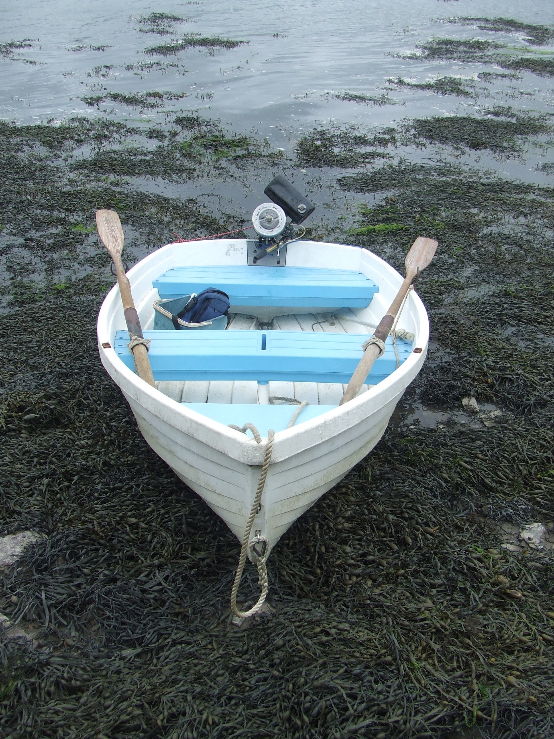 This is the Work Tender, it lives permanently on the rocky beach and gets pulled up and down over the kelp. Usually I just row around the moorings but today I decided to give the Featherweight an outing.