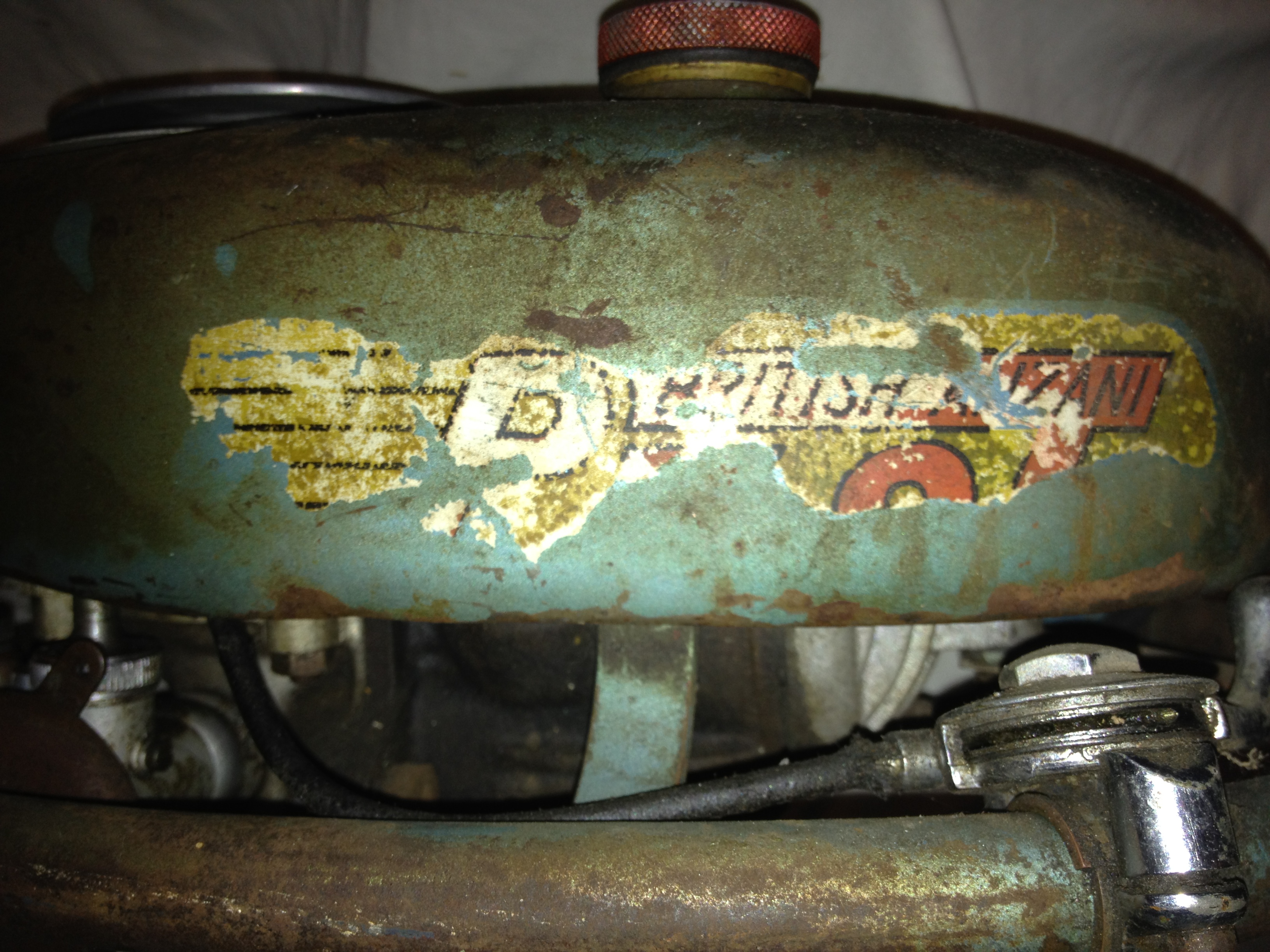 By the mid 50's the decal was a single wing on either side of the tank with the Pilot name. Late 50's double transom clamp and a more rectangular decal with the British flag and Pilot name on each side of the tank. This is also when we started to see painted legs and mid-sections.