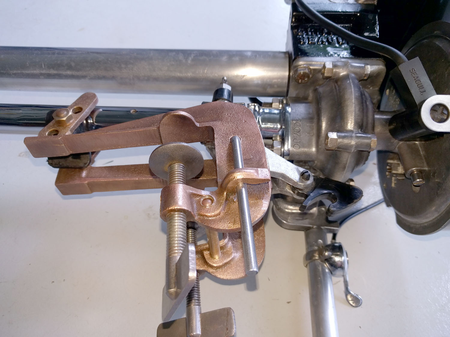 I've been mucking around with a Silver Cenury that I have had for years. The gearbox was shot, the barrel was rusted, and it did't have a transom bracket so it was mainly just for parts. I repaired an old cylinder barrel so decided to resurrect the Silver Century. I found an ad on Gumtree for the missing parts and collected them today. The parts came with a 40 plus as well, so I guess I have another project. The box of bits had a couple of tillers that I hadn't come across before. They are made of brass but have a bracket welded to the end. The grips look like genuine Seagull. Any idea what model (if any) these tillers came from? The round tank appears quite old as it has the hex nut and not the round for the fuel tap thead.
