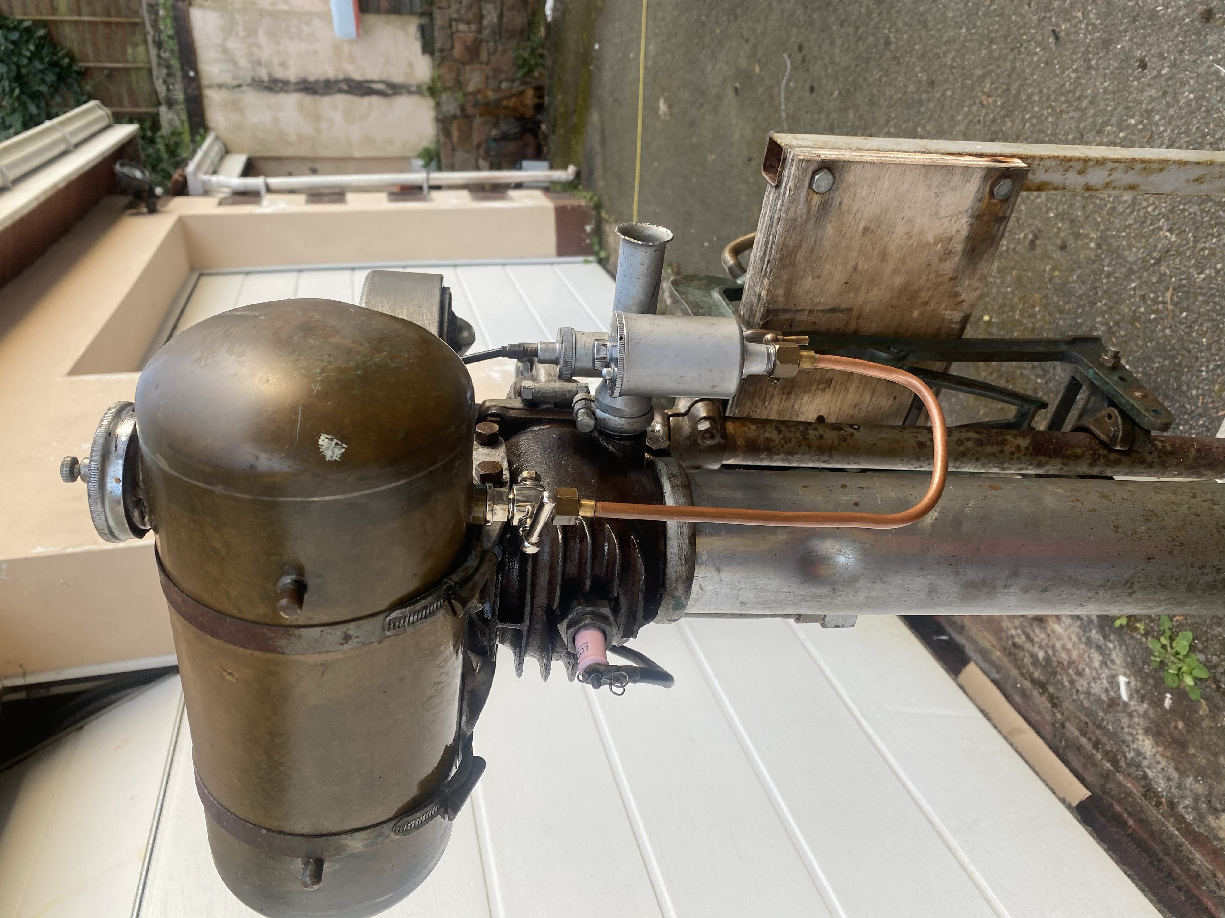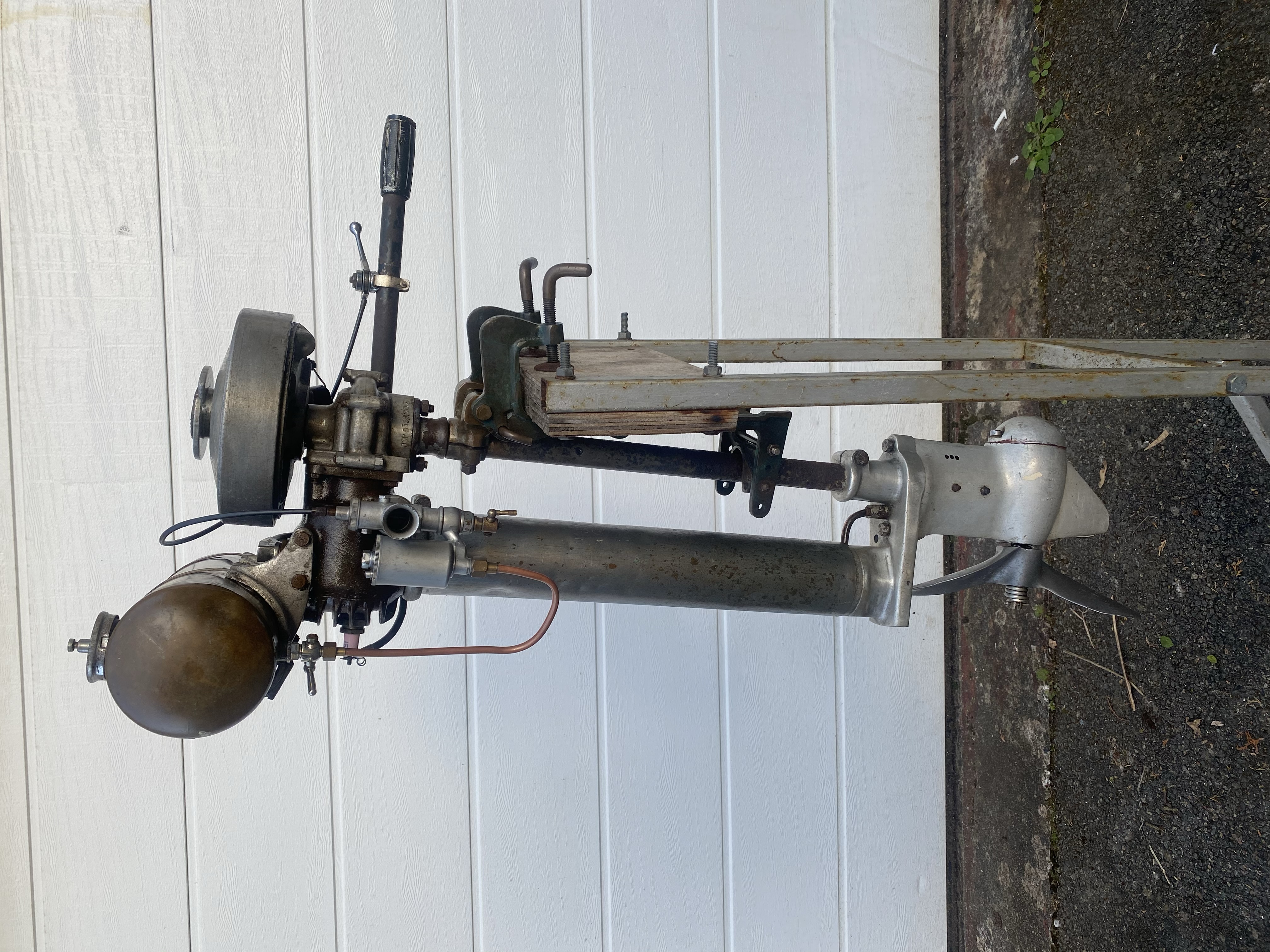 As I’ve been away I’m stuck with this self isolation so into the workshop, I’ve managed to find some period Marston parts, I’m lucky to have had a spare ignition and flywheel of roughly the right year, JM 1984 number stamped on the flywheel and baseplate, I’ve put an early straight out of the back exhaust/pump housing, not quite correct as the original would probably have had a rudder pintle that all pre war gulls seem to have but close enough for now, fitted the correct type prop although a little later as well as the correct barrel, carb float chamber, inlet trumpet, fuel tap, throttle lever and steel tiller although the original may have been chromed, so all I need now is the patience to find a fuel tank with the filler in the middle, one piece tank mount, pump housing with pintle and a transom mount although the bronze skeleton I’ve used is pretty, quite rare and only a few years younger, saying that the original would be nice.