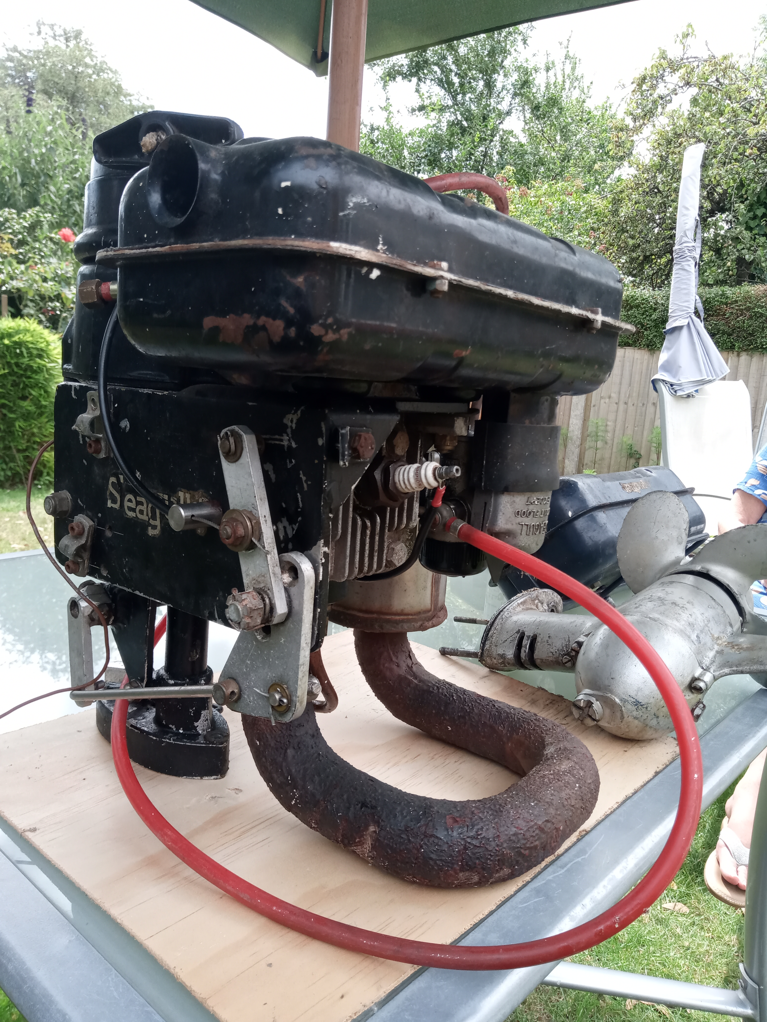 Yes definately the Amal carb,the 'finish' on the exhaust is different to that in the picture of this unit on the SOS website taken over 20 yrs ago, very similar to the ceramic wrap used on many custom cars and bikes.The craft this unit was fitted to was wooden with the immersed portion of the hull fibre glassed over and luckily the adaptor plate bolted through and not incorperated in the hull with neoprene gaskets making the seal between the power unit ,the adaptor and the FNR gearbox.The gearbox must have suffered some damage previously because the fixing flange has been welded in one place and an aluminium fin ,an obvious afterthought, fitted to the hull forward of the gearbox to afford additional protection in the event of grounding.The Seagull fuel tank was remotely mounted but is shaped as if to fit around the top of the engine but there are no obvious fitting points and I have yet to find a picture of one of these engines with the particular tank fitted!!!