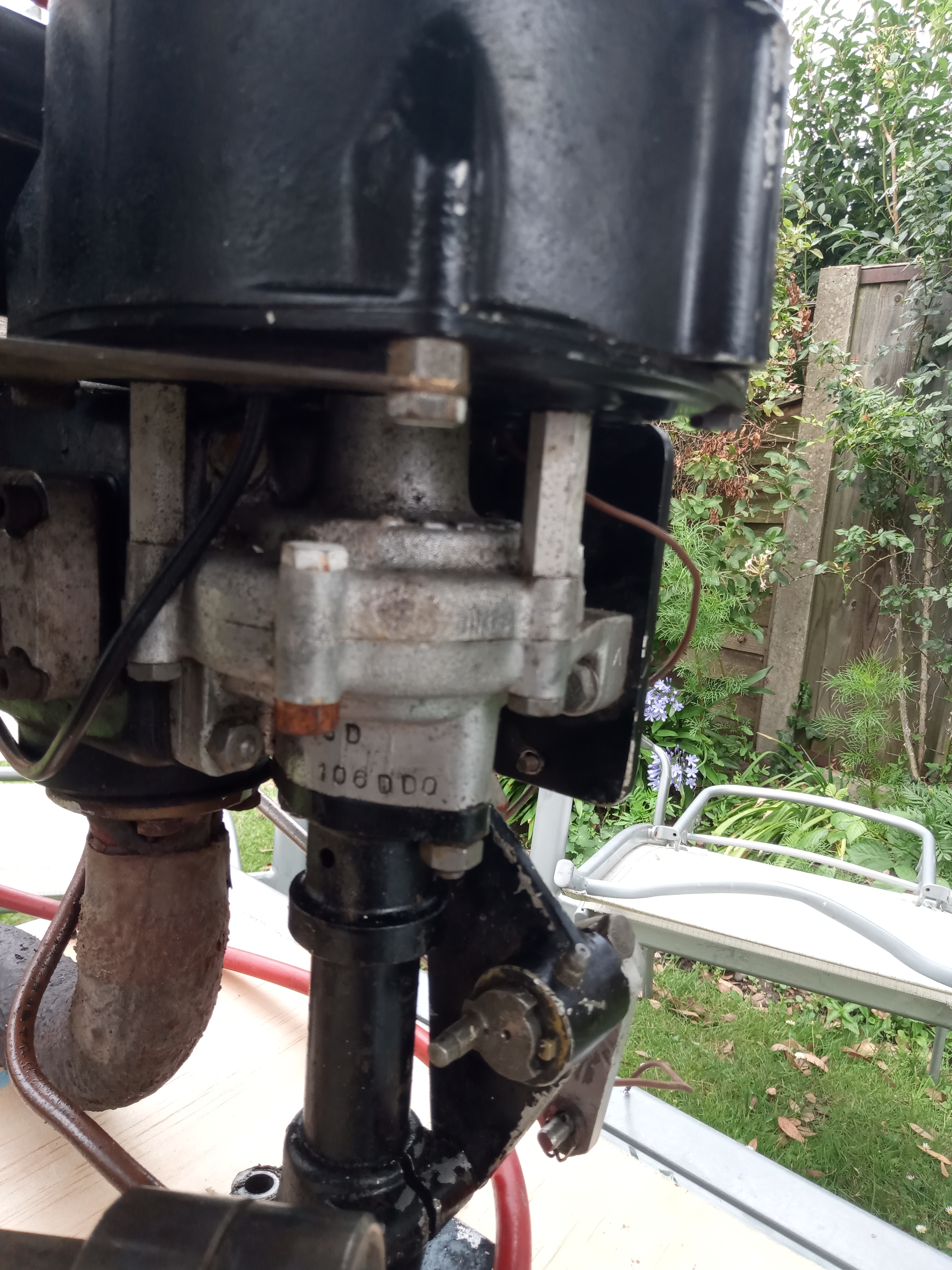 If I remember right, the carb if original should be an Amal 419, the exhaust is asbestos lagged up to the stainless water cooled "silencer" & it should come with an aluminium hull plate that's probably fibre glassed into the hull as that's the total motor support.