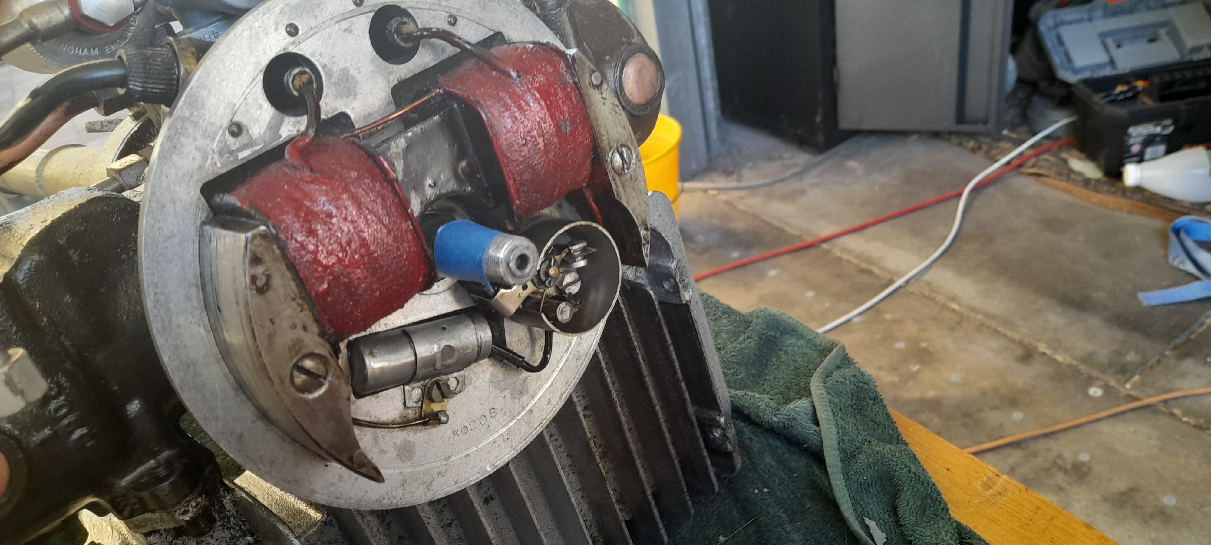 I checked the timing as found. 52 Deg....WOW no wonder it ran ragged last time Mike used it. Very hard to start and sounded unhappy. Also would not run with the exhaust bypass closed. The isolated points with a multimeter (Beep setting) to confirm that. The point gap was totally out there as well.