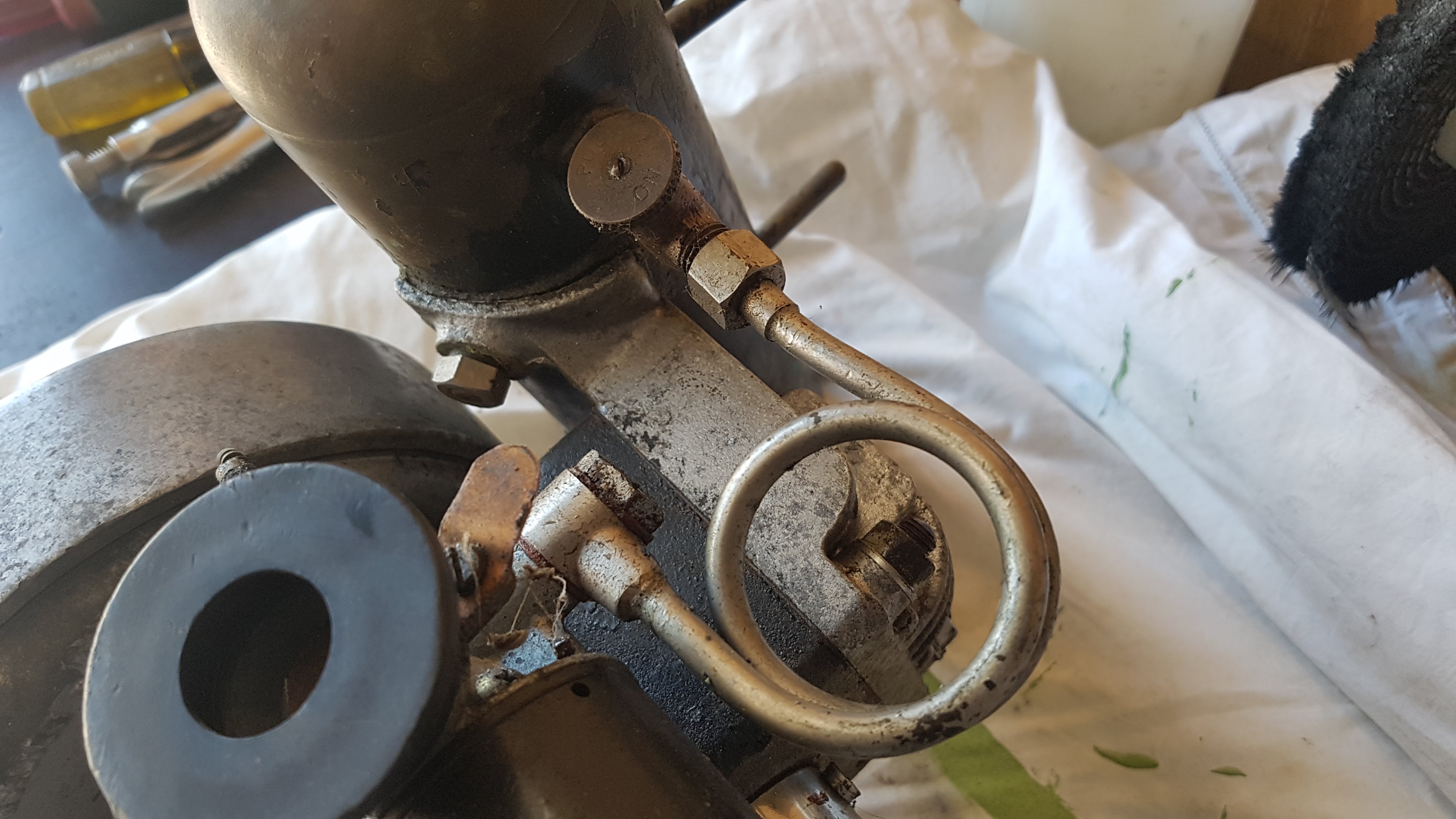 Some general pictures as the stripping down gets underway. No surprises so far. Gear box has turned out to be in good condition so the no turning issue is in the powerhead unfortunately. Flywheel came off without fuss but the ignition base plate needs careful persuasion. The carby plastic parts are rigid, like Bakelite. Does this look like a case of a much later Villiers Carb or was there and early type like this one?