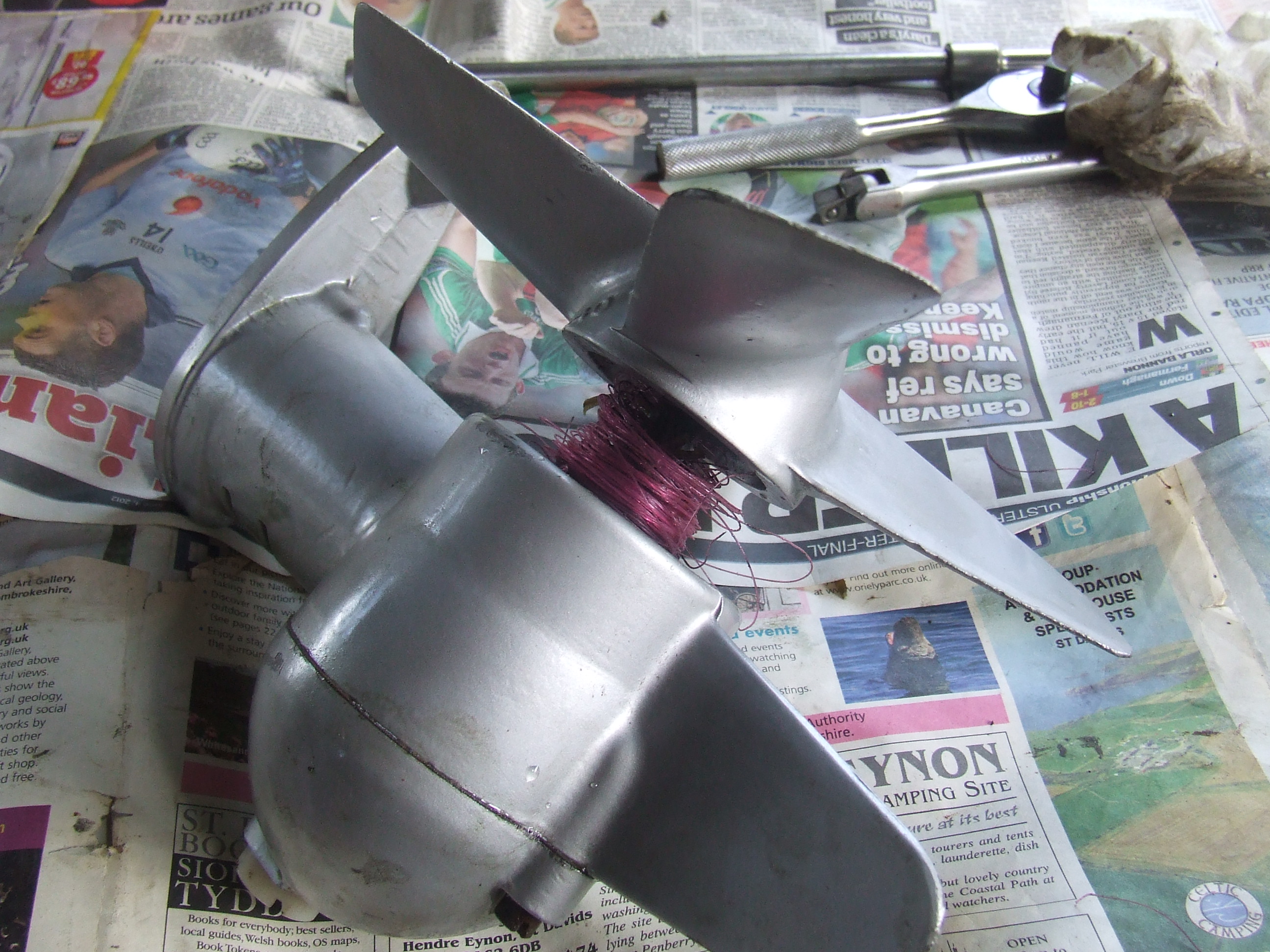 No sign of any thing amiss. But here is the reason the Gull ceased to proceed! She had managed to draw in all the fishing line filled the back of the prop without any showing on the outside. A lot of it had got between the collar and the gear box eventually it melted and the melted line jammed the shaft but left the prop free.