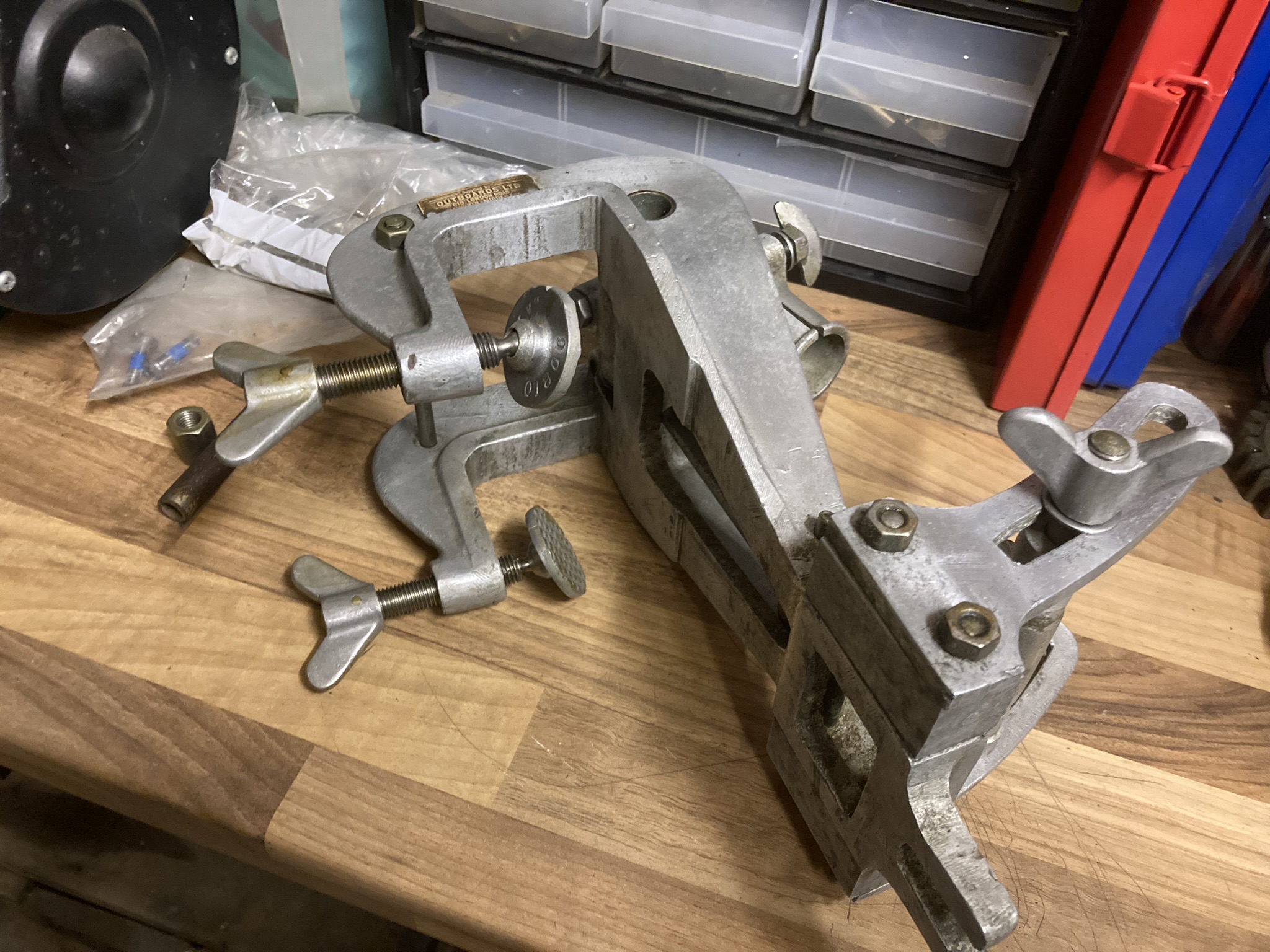 First job was to do a general clean and check over, followed by taking a close look at the transom bracket. It was mostly all there, but several seized up fasteners to deal with. It had a broken and seized screw in place, which came out with a little heat and gentle persuasion, followed by re-cutting the threads and fitting new screws, I had obtained replacement transom screws and pads from the Marston Register.