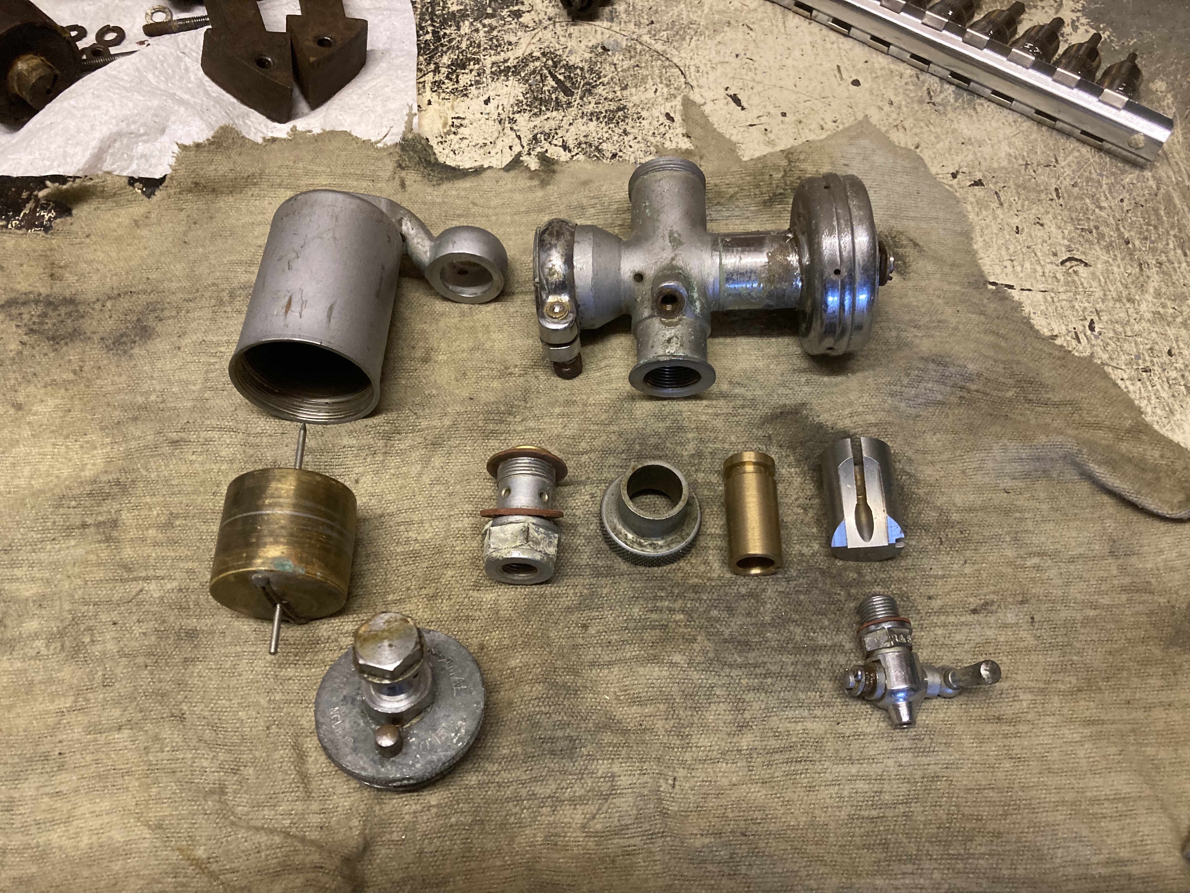Next job was to strip and examine the carb, which was missing the small brass shaft that connects the carb to the gear linkage. With this model when you put the engine into gear, it automatically opens the throttle to whatever the throttle lever is set to. Drop it into neutral and the engine drops to tickover, set via the tickover screw on the carb. Clever